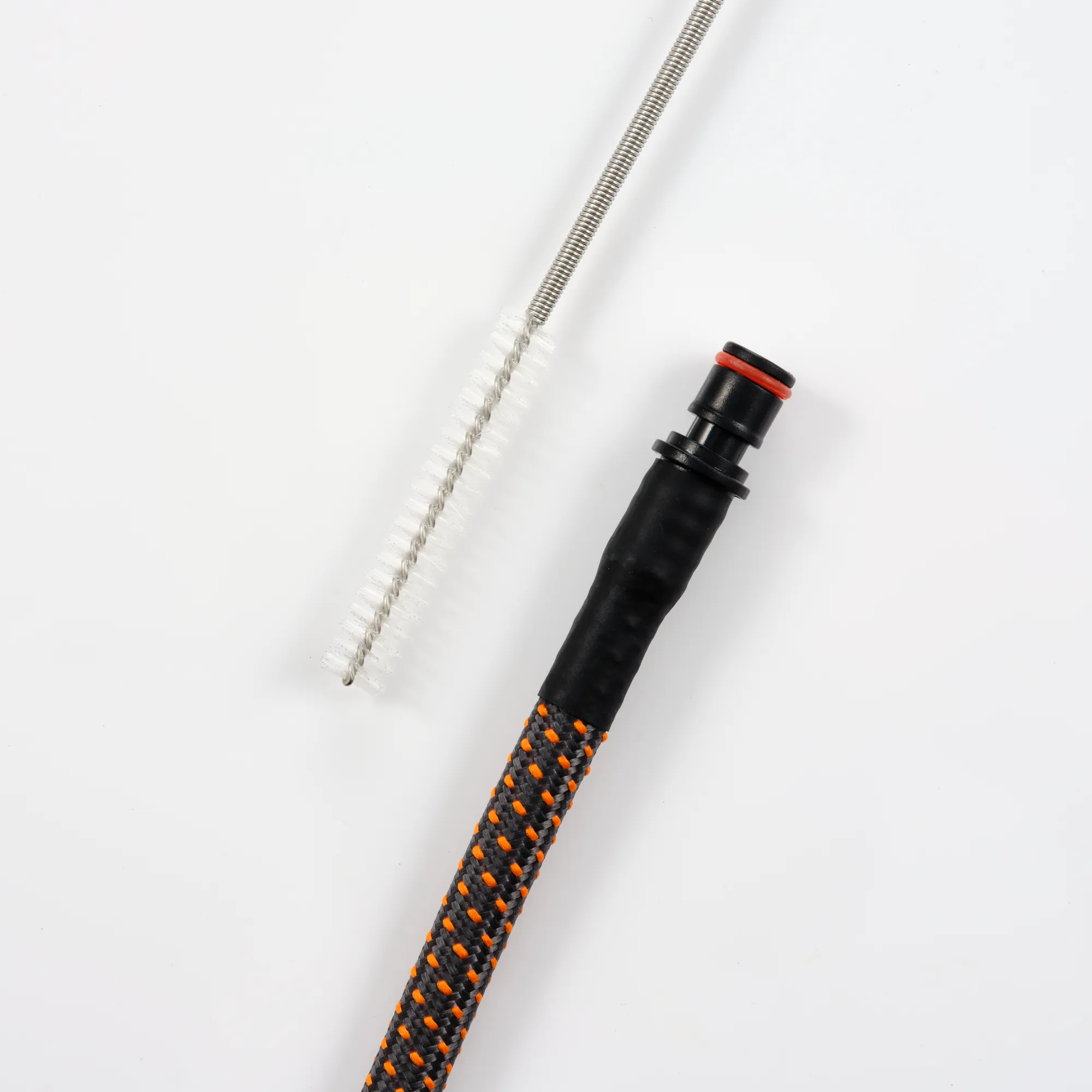 - Feed the long flexible hose brush into one end of the hose.